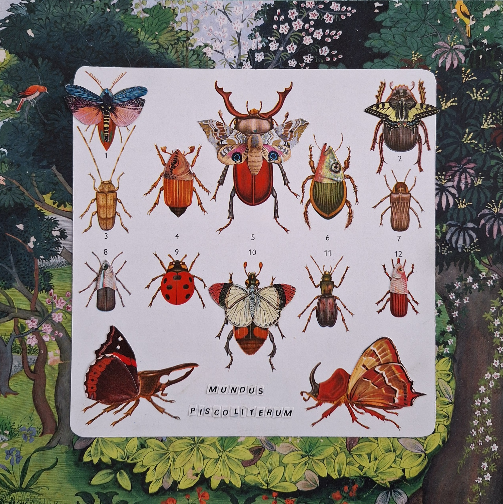 Collage Fantasie Dieren Kevers Vissen Vlinders Modern Bos Bloemen Vogels