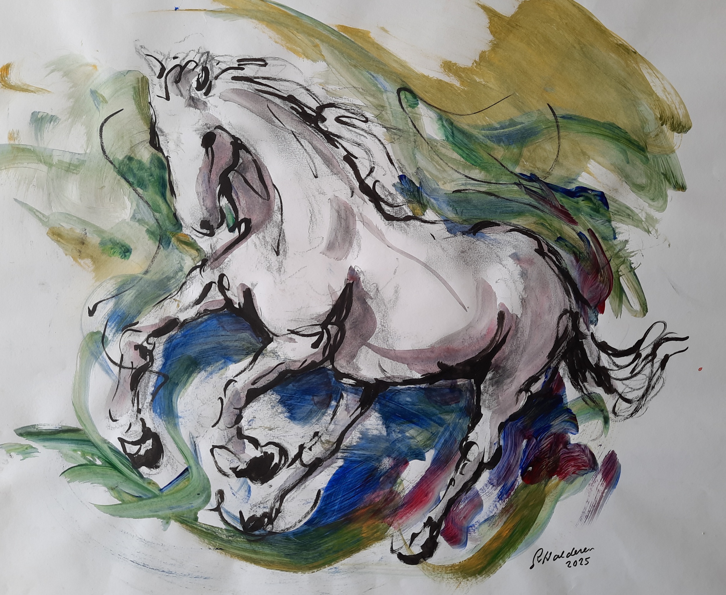 Expressie dynamiek en kracht paard. Inkt en acryl op papier.