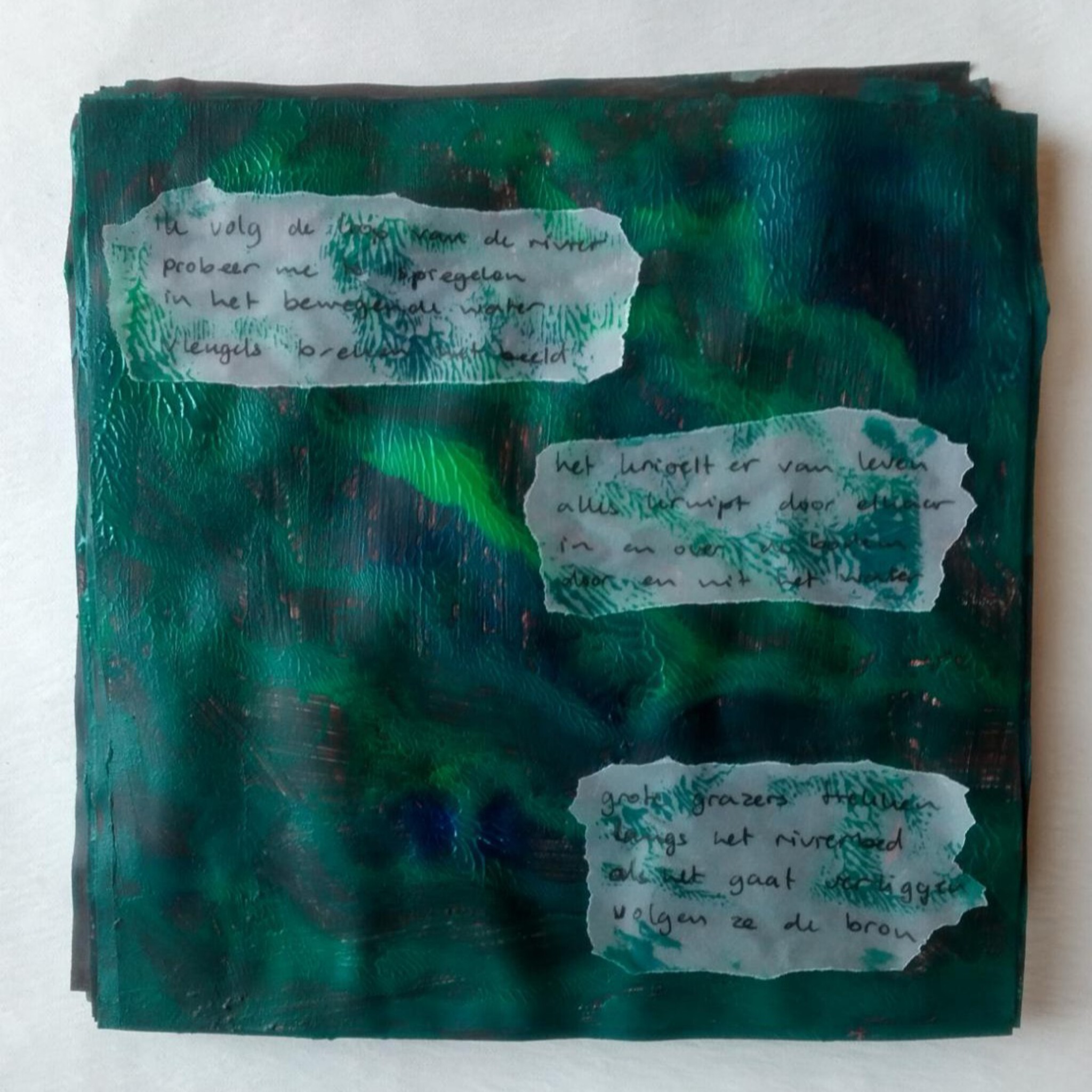 Portret van de Ooijpolder vanuitvogelperspectief. Poëtische interpretatie met hergebruikte posters, acrylverf en drie strofen op schetspapier. DOORLEEFD LANDSCHAP ik volg de loop van de rivier probeer me te spiegelen in het bewegende water vleugels breken het beeld het krioelt er van leven alles kruiptdoor elkaar in en over de bodem door en uit het water grote grazers trekken langs het rivierbed als het gaat verliggen volgen ze de bron