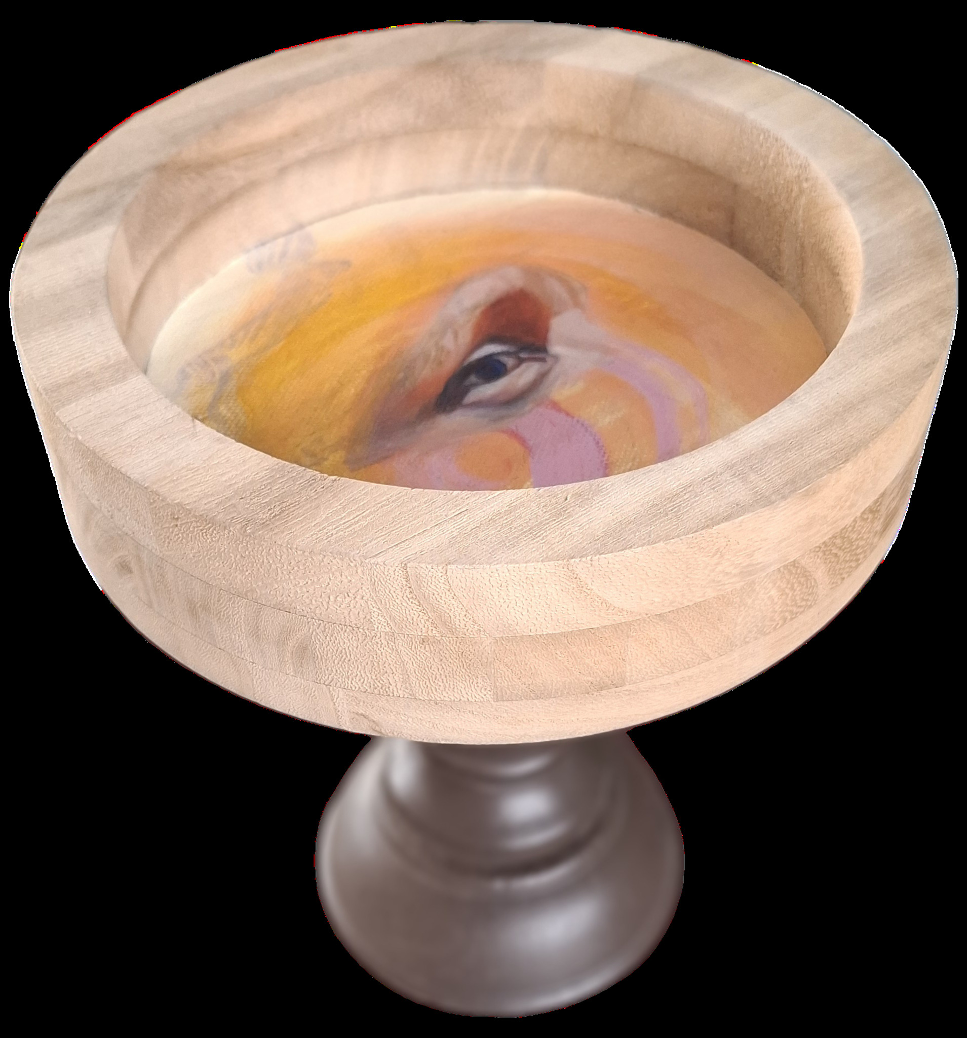 Ronde houten schaal op voet met een oog voor detail