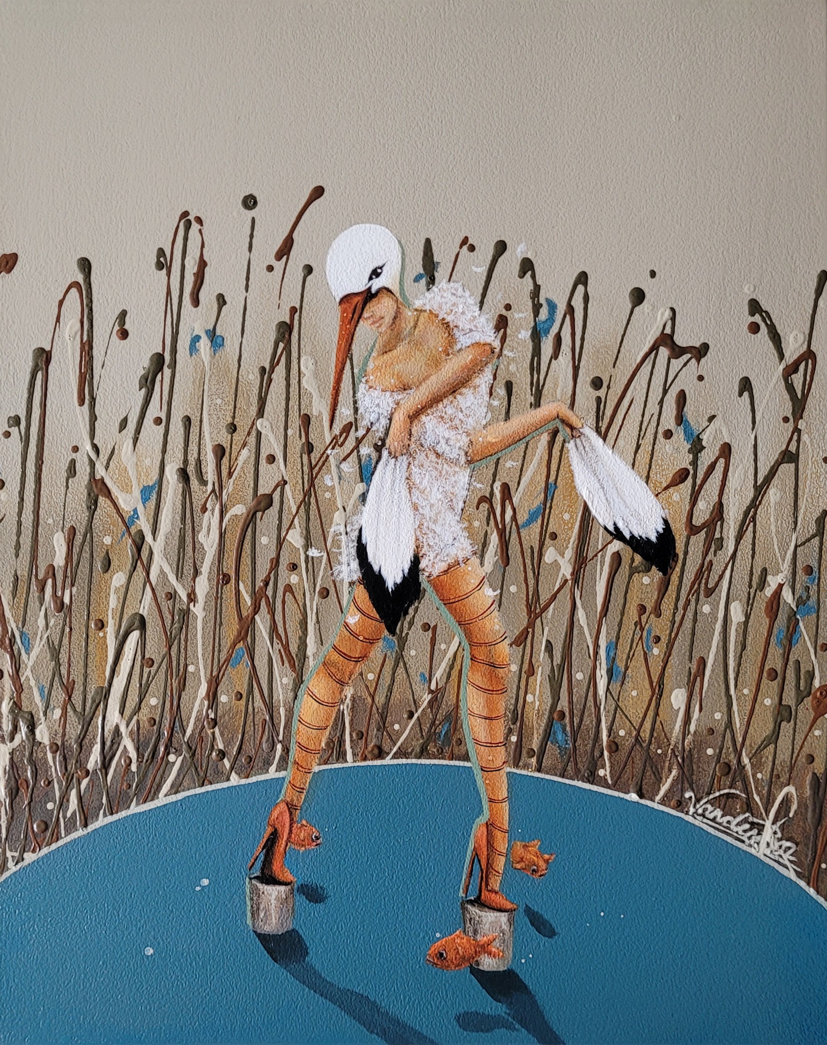 Little Treasure in petrol blauw en bruintinten. Afbeelding van een ooievaarsvrouw in een vijver waar visjes om haar heen zwemmen. Afm. 30x24cm het schilderij heeft een blanco houten baklijstje. Verkrijgbaar bij SHE Art Gallery in Nuenen.