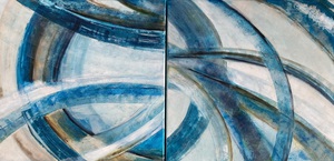 Abstract schilderij, geometrisch, gelaagd,blauwe tinten, tweeluik. Kan ook anders opgehangen worden.