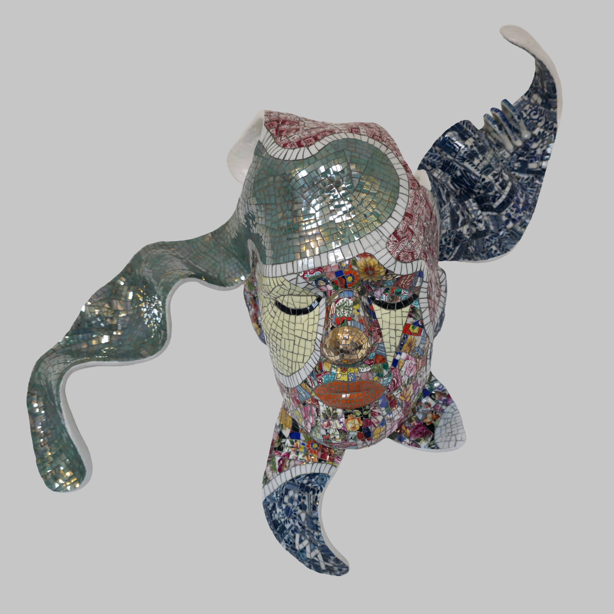 En alweer een wandsculptuur. Nr. 11 in de rij. Een combinatie van rood, groen, blauw, wit, goud, geel, oranje en divers porselein. Incl. de 3 oortjes en initialen WA. Deze is dus TE KOOP !
