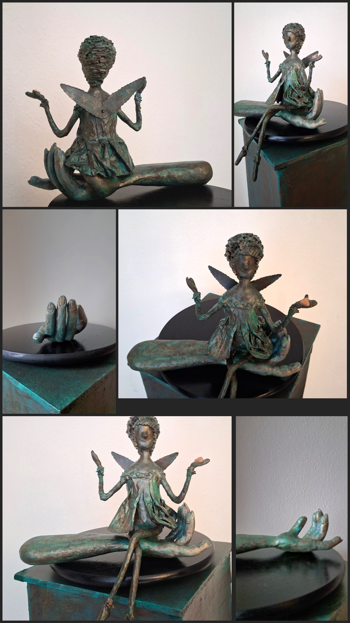 “Op haar bronzen zitplekje wiegt ze zacht, alsof ze een liedje in haar hoofd heeft. Een kleine engel met een warm hart, die je even laat voelen dat licht ook speels mag zijn.” De Happy Angels hebben een zithoogte van ongeveer 20 tot 25 cm (excl. de beentjes) met een totale lengte van ca. 55cm. Mixed media o.a. van papier-mache, papierpulp, acrylverf en uv vernis.