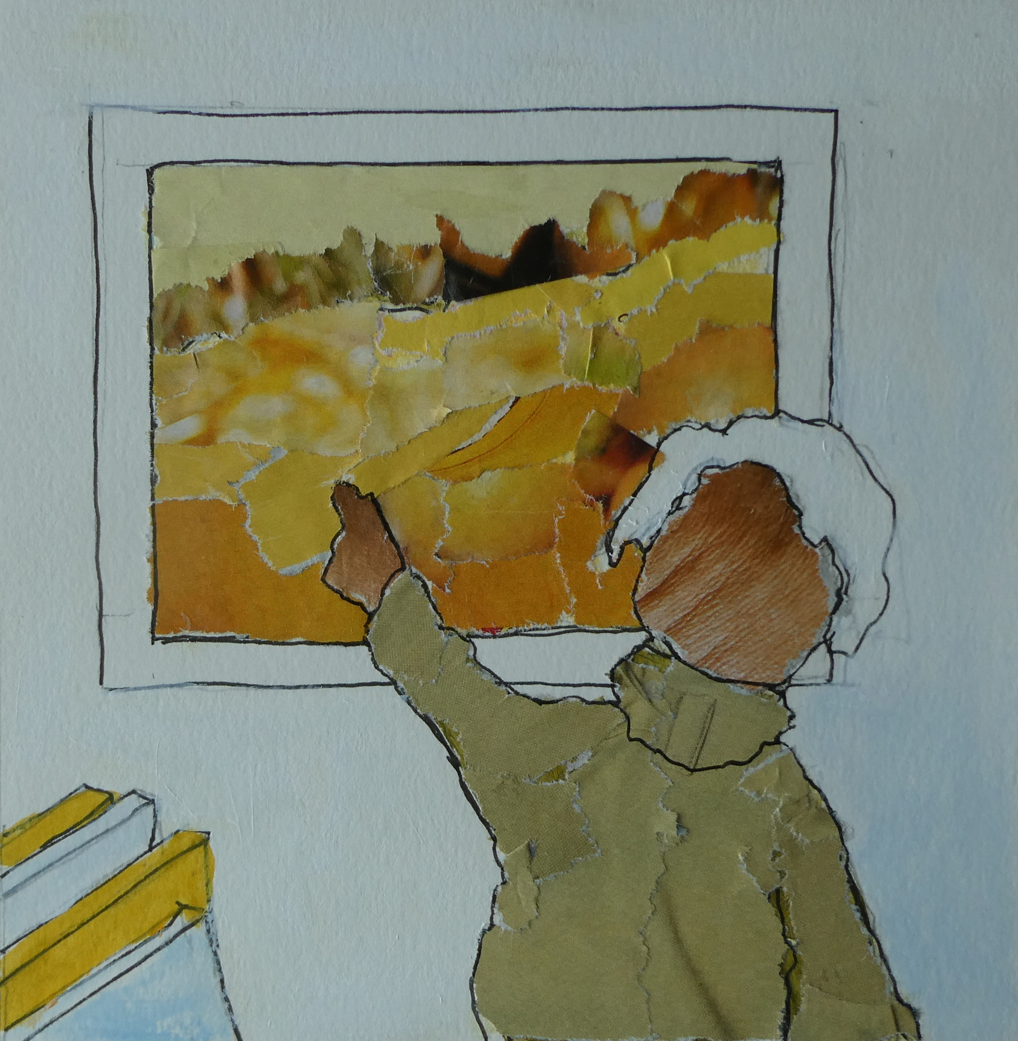 In gesprnek over het werk van een bevriende kunstenaar. Wat is het verhaal achter het werk? Op papier in mixed media.