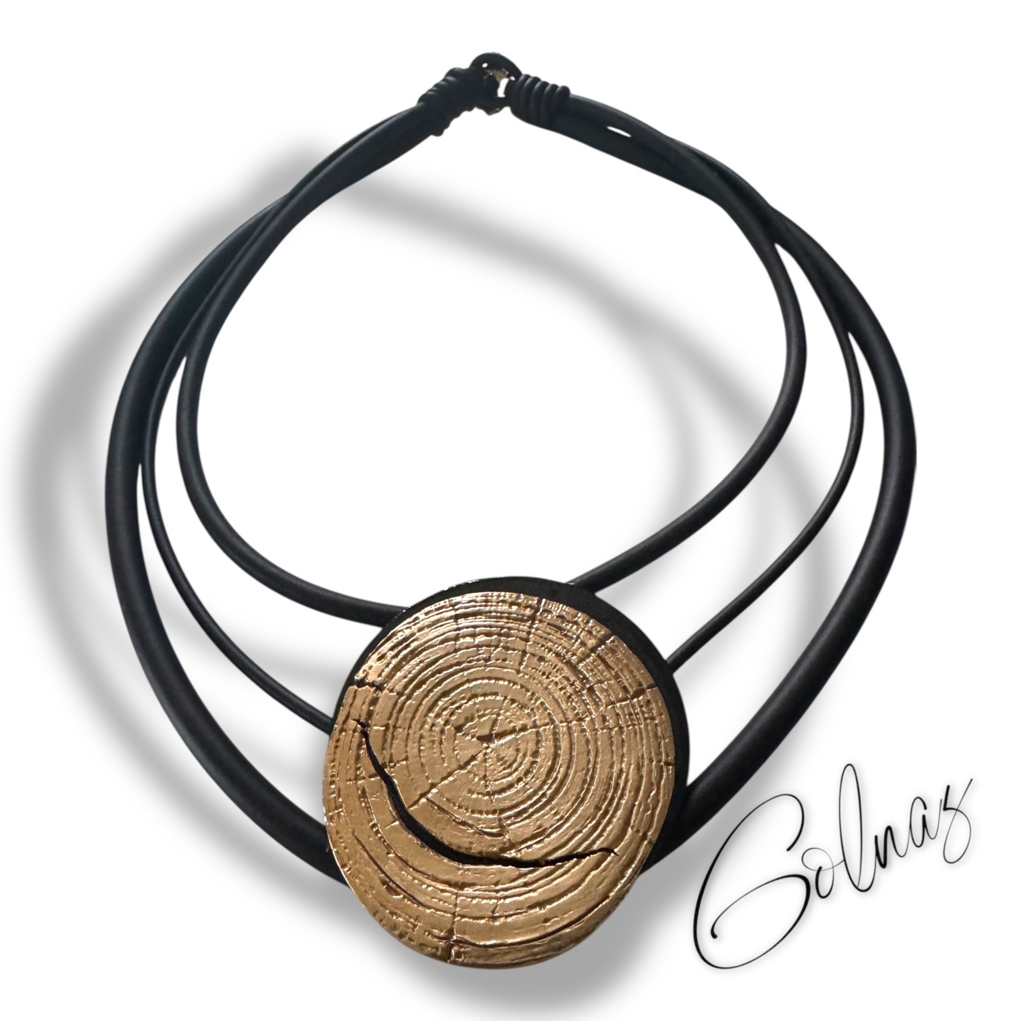 Bronzen ornament aan rubber ketting.