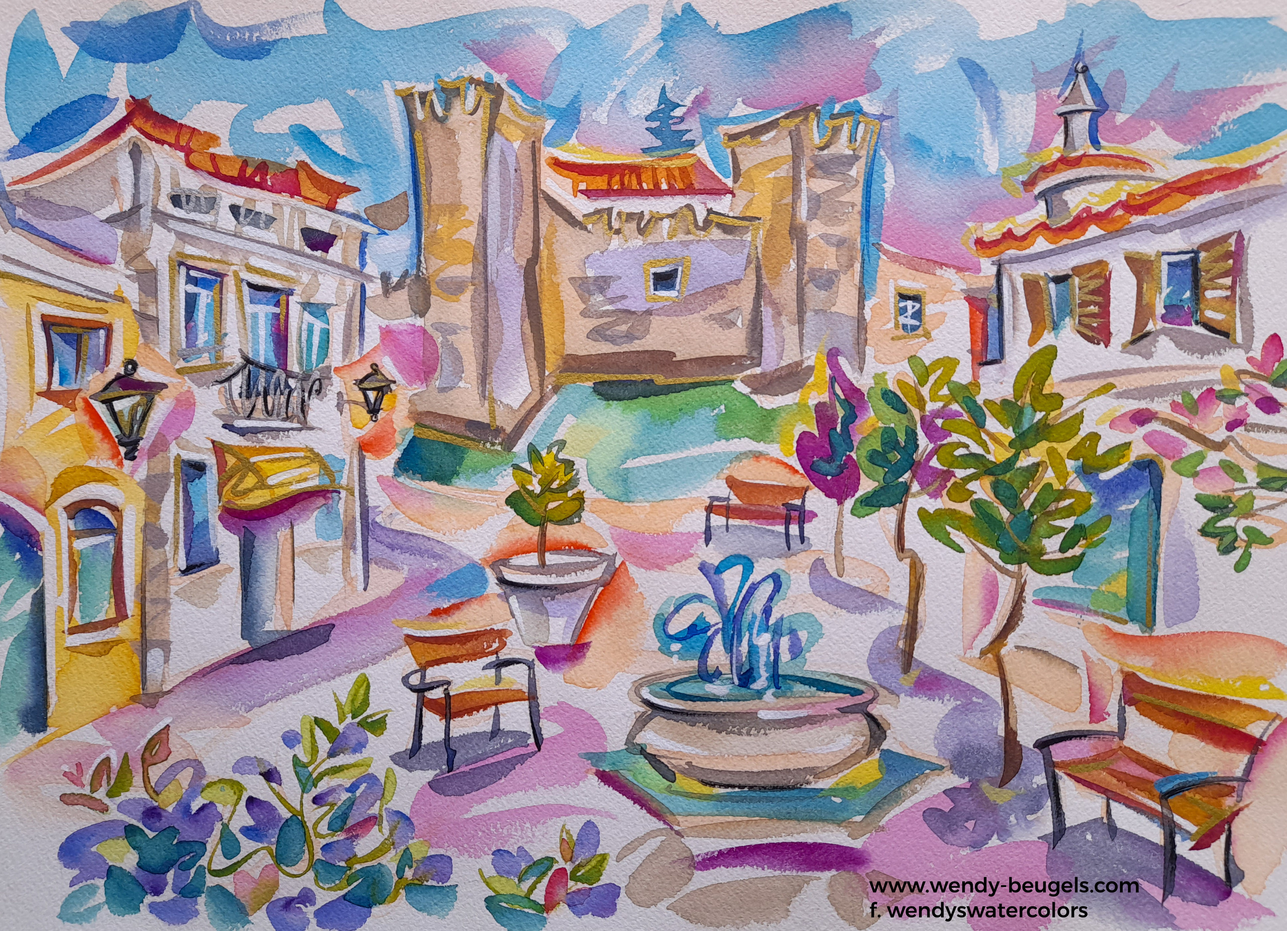Loule Algarve Portugal Castle Sun City Scene Happy Watercolor