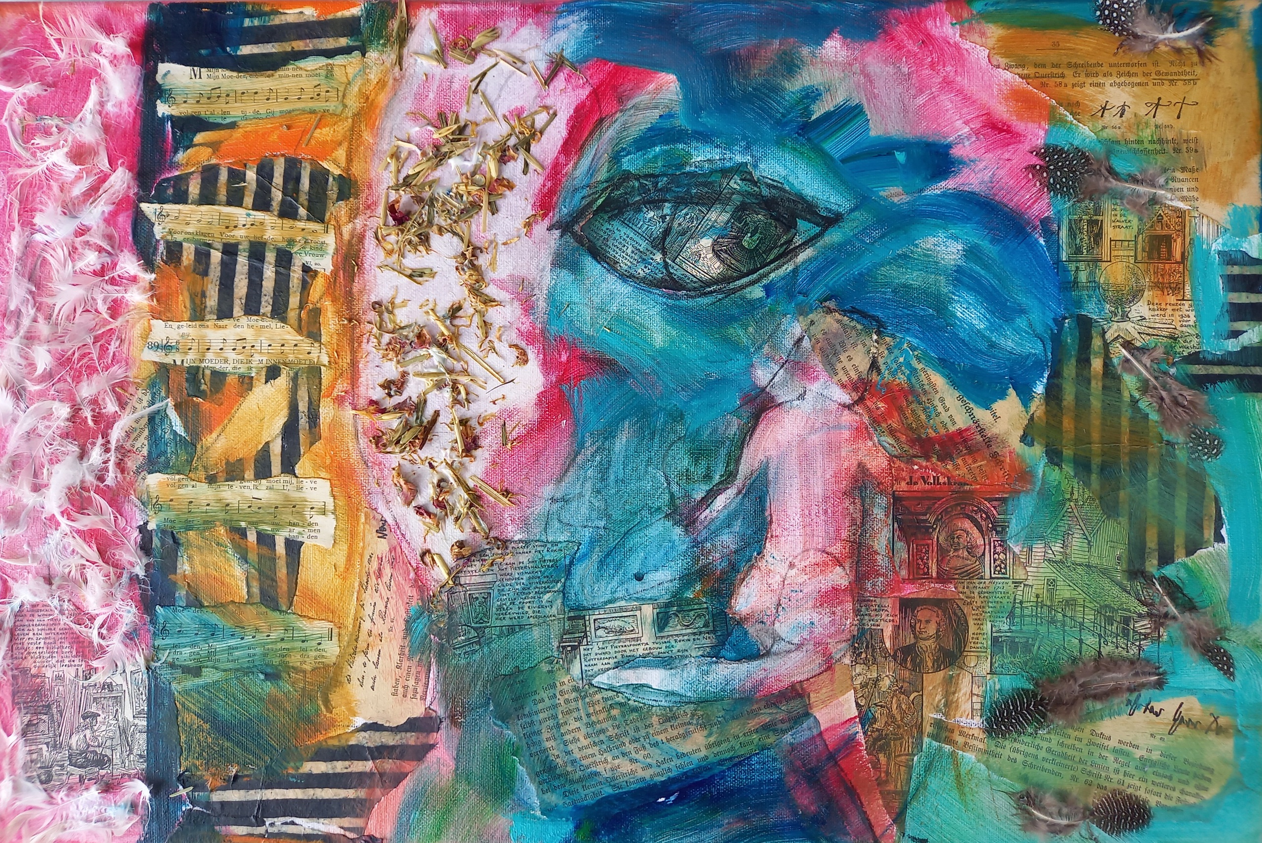 Collagewerk met gemengde technieken. De druk van het leven, de chaos en het geleefd worden.
