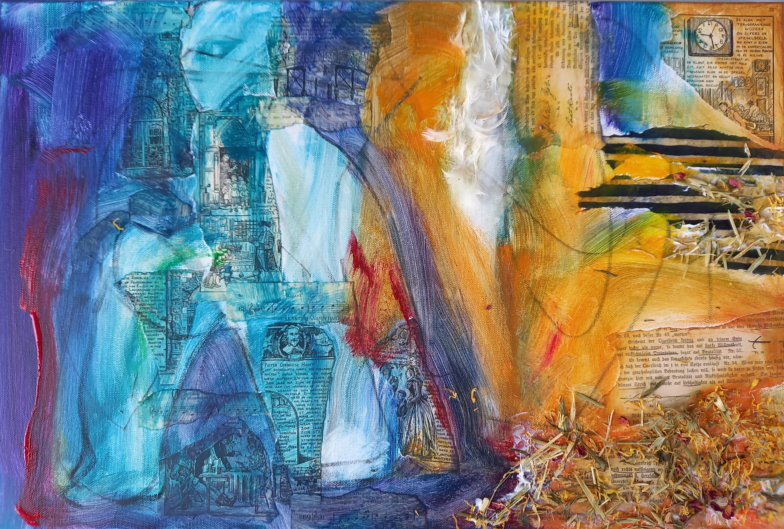 Collagewerk met gemengde technieken. De druk van het leven, de chaos en het geleefd worden