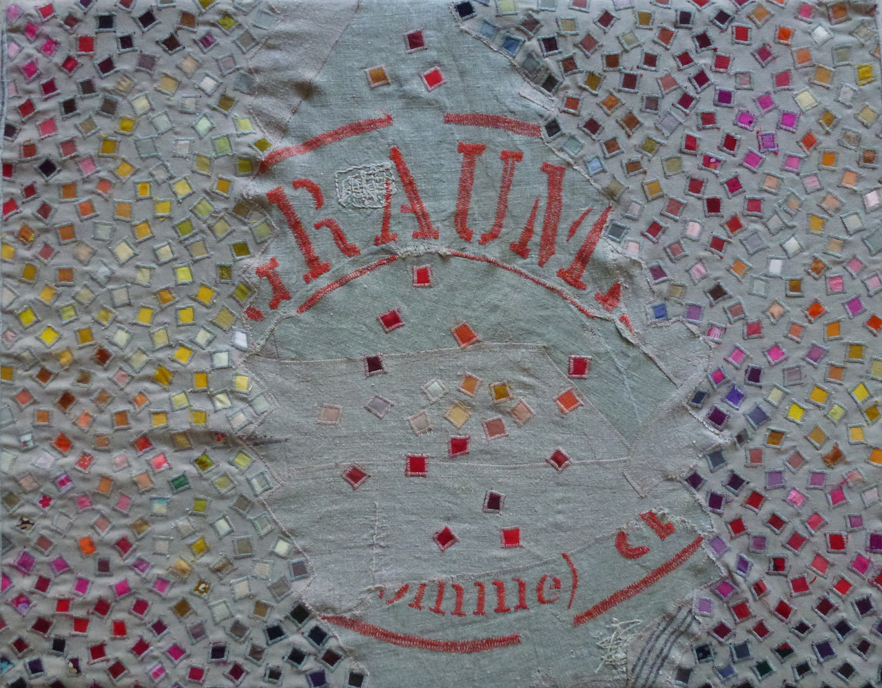 Adinka Tellegen maakt doeken die ‘geschilderd’ zijn op de naaimachine. Er komt geen pen, geen potlood en geen penseel aan te pas, alleen stukjes textiel en machinegaren. Dat is pas van dichtbij te zien.