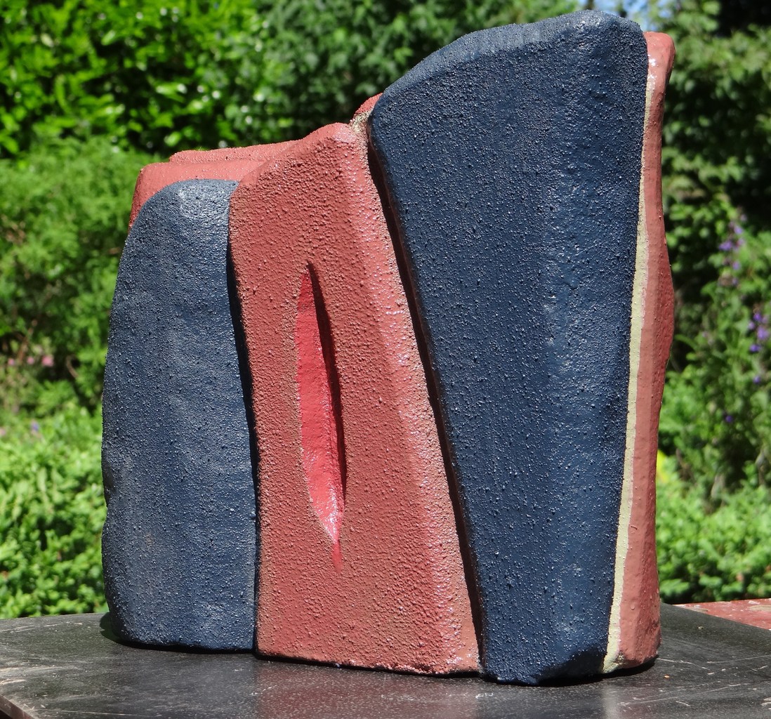 Bij de constructie van een raam voor ons atelier, werden blokken gasbeton verwijderd voor later gebruik. Kerven gaat makkelijker dan in steen, en het gewicht is makkelijker te hanteren. Nu is dit een beeld dat herinnert aan een muur van rots in de Corsicaanse bergen, op weg naar de piek van de Monte Petrone (1767m). Deze 'muur' rees zo'n 60 m omhoog, en het was moeilijk om een 'schoorsteen' te vinden die ons op hoger niveau bracht. (Schoorsteen als vertaling voor term van bergklimmers: chimney)