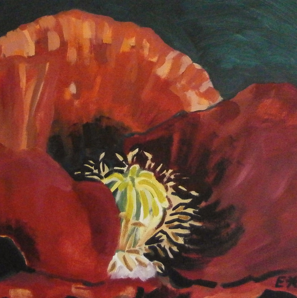 Een enkele bloem uitvergroten en schilderen, dat doet het altijd goed! Vrolijk portret van een trotse papaver.