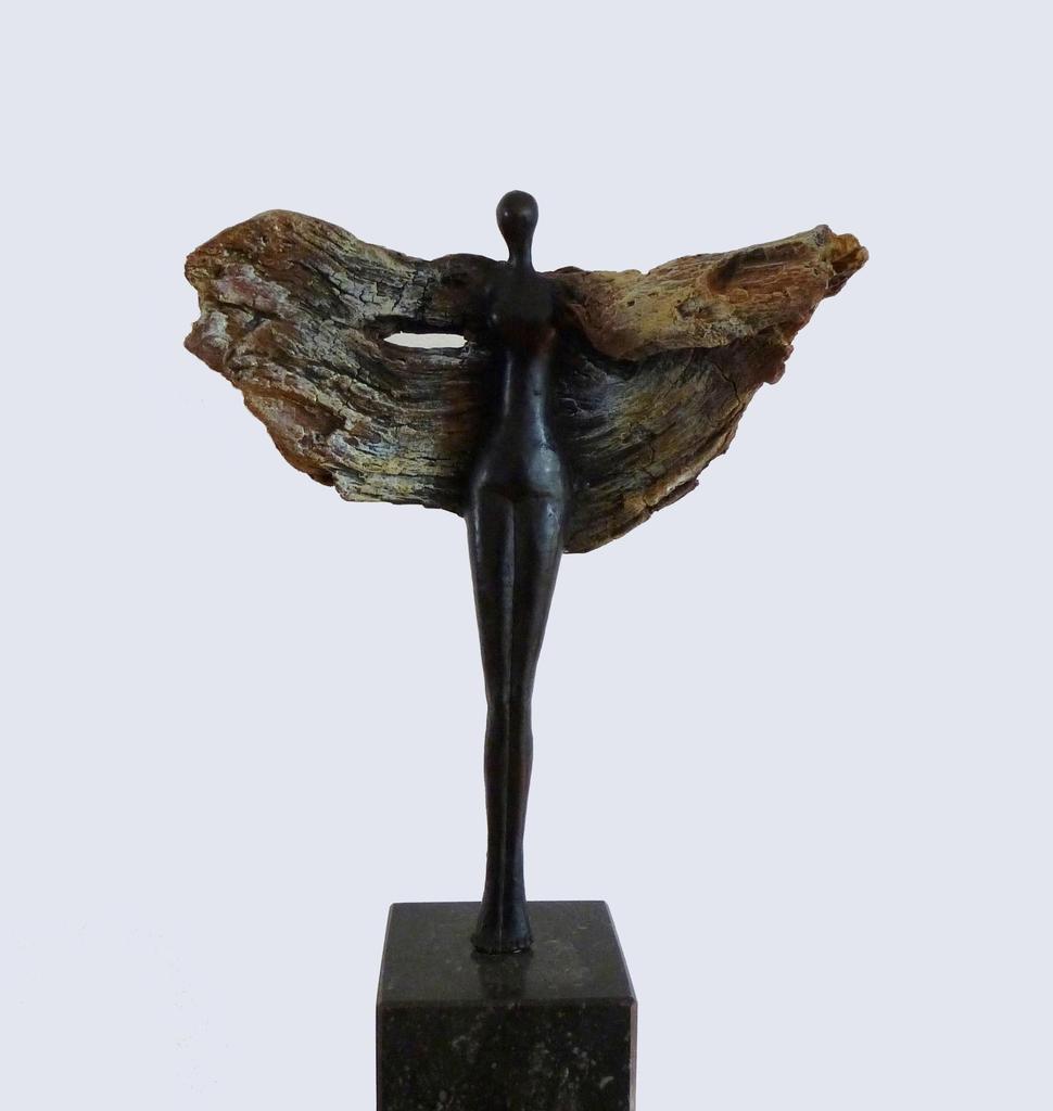 Een volledig bronzen sculptuur al doen de "vleugels" anders vermoeden. Een nadere uitleg heeft dit beeldje niet nodig. De titel zegt al genoeg. De hoogte is inclusief een hardstenen sokkel van 17 x 8 x 8 cm. Van dit beeld worden maximaal 12 exemplaren gegoten. Andere en hogere of lagere sokkels zijn mogelijk. No: 4 van 12 is verkocht