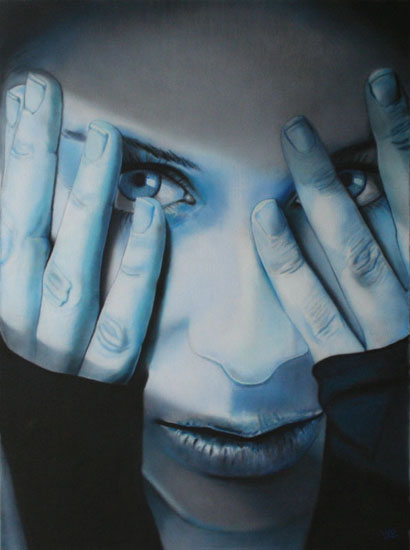 Vrouw Meisje Portret Gezicht Handen Airbrush Acryl Realistisch Blauw