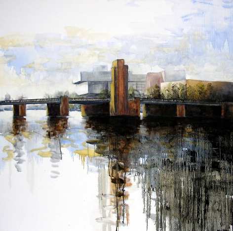 Uit de zesdelige serie 'bruggen over de Amstel' is dit de Berlagebrug, geschilderd met dunne olieverf die het ijle karakter van lucht en water het best benadert.