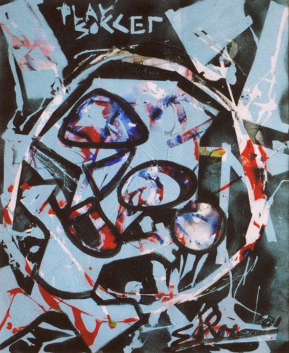 Een potje voetbal spelen op straat of op een veldje is het onderwerp van dit werk. De keeper vangt de bal. Elementen van Ajax en Feyenoord zijn in dit werk aanwezig. Het werk is groten deels met spuitbus bewerkt.