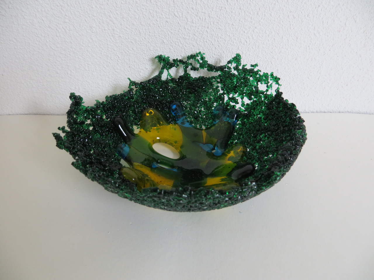 Groen schaaltje; de basisondergrond is geel, blauw en groen glas, uitgevoerd in glasfusing. De groene rand is met de pate de verre techniek gedaan. Het lijkt net groene kroos. Zo mooi!
