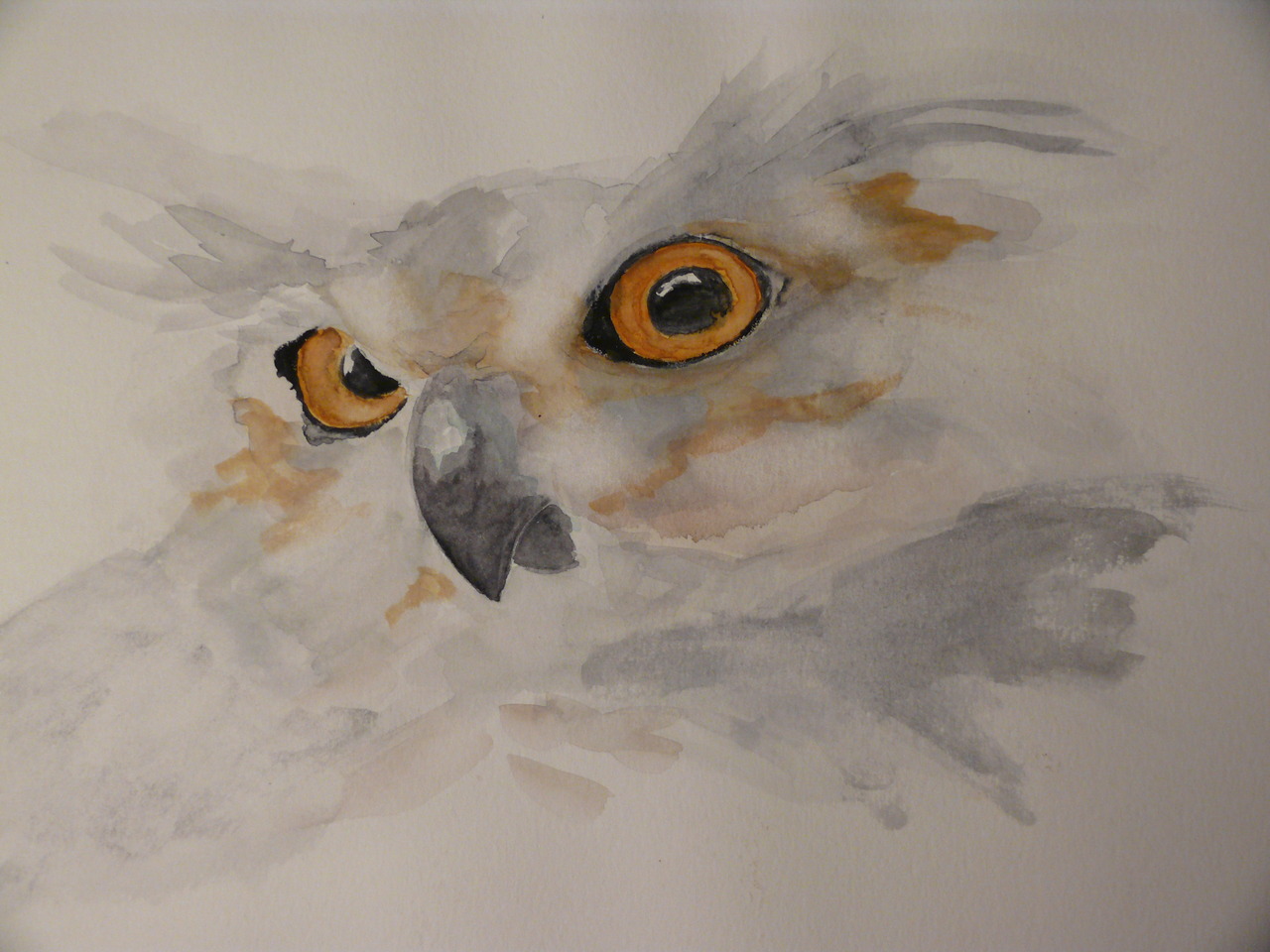 Uil, mijn eerste echte Aquarel, naar een voorbeeld uit studieboek