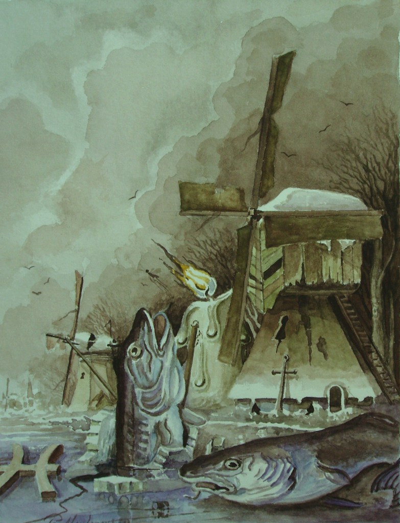 Vis Zee Winter Landscap Aquarel Papier Anker Molen Kaars Vogels Realisme Fantasie Romantiek Sterrenbeeld Zodiac Horoscoop Dierenriem