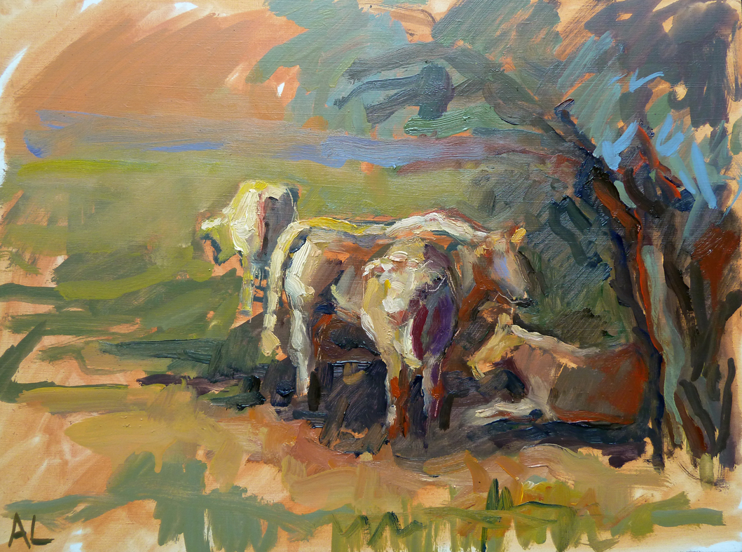 'In de schaduw van een boom' Charolais koeien onder een prachtige oude wilgenboom. Plein air geschilderd in de hete franse zon.