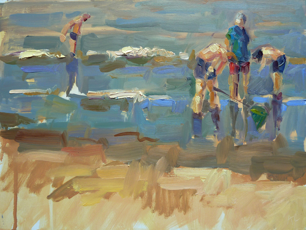 'Waterpret nr. 2' met het schepnet op zoek naar bijzondere vondsten uit zee. Plein air geschilderd op het strand van Noordwijk aan Zee.