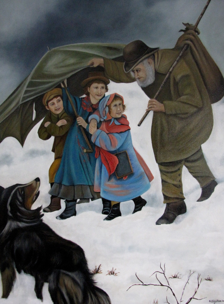 onder moeders paraplu olieverf op doek incl. lijst