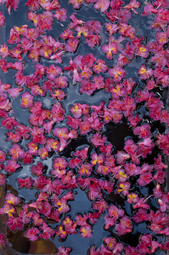 bloemstilleven met rode paardenkastanje voor blauwe actergrond