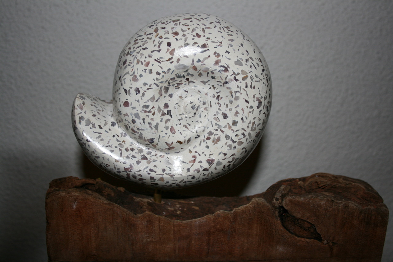 Slak met bruine granito en teakhouten sokkel
