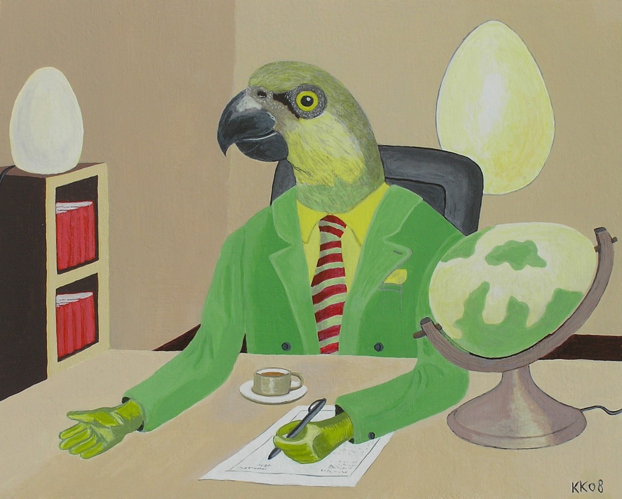 De vogelmens schuift het contract naar voren. De koffie staat klaar. Tekenen?