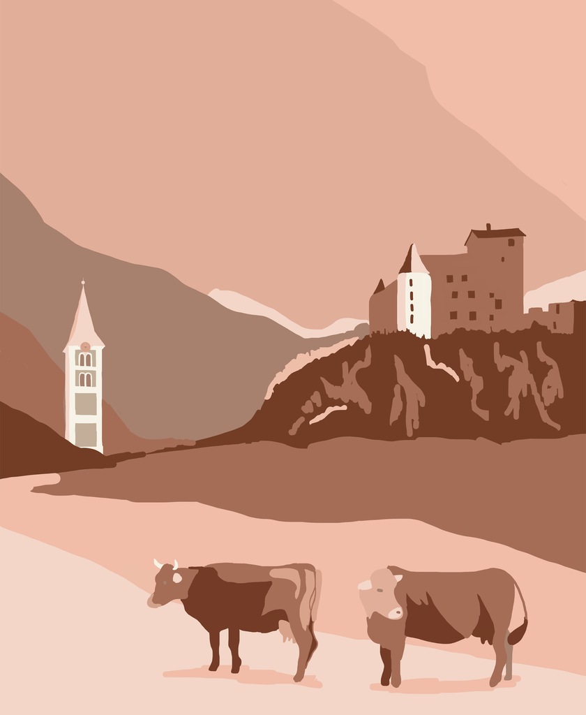 Met de iPad digitaal getekend. Een artists impression van het dorpje Nauders in Oostenrijk. Twee luik met Chateau in Tirol met dezelfde kleuren. Voor een print zie http://lidabruinen.werkaandemuur.nl/index/132/nl/Nauders-in-sepiakleuren/view/54969/9