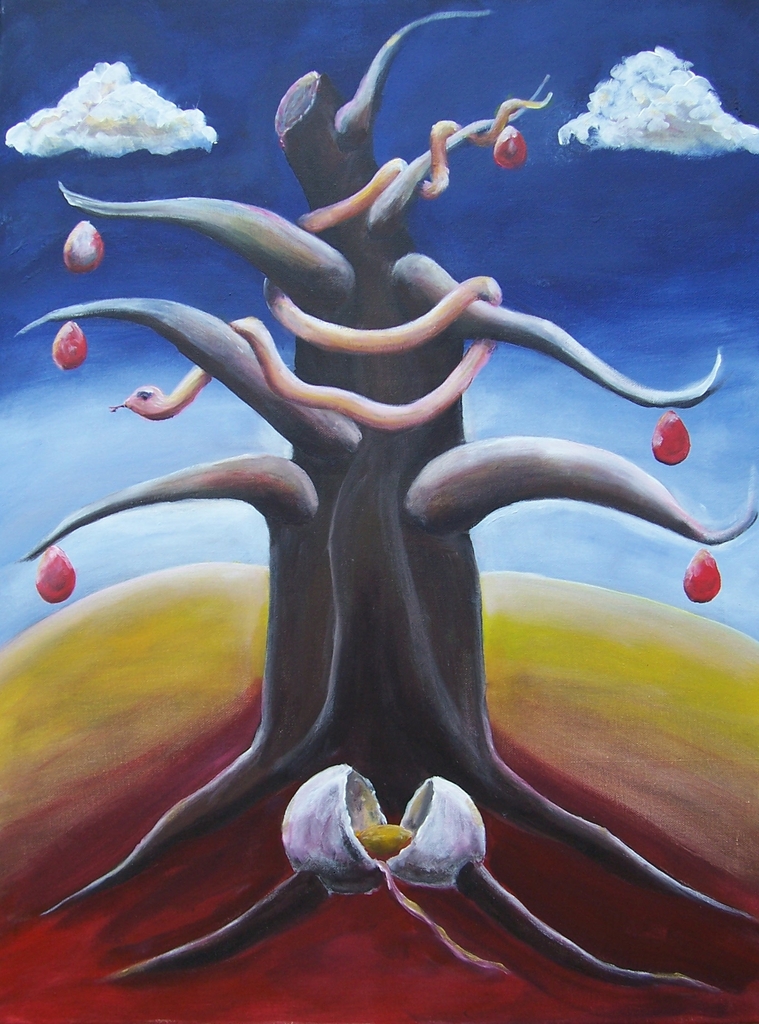 Gebroken ei. bij een boom met vruchten