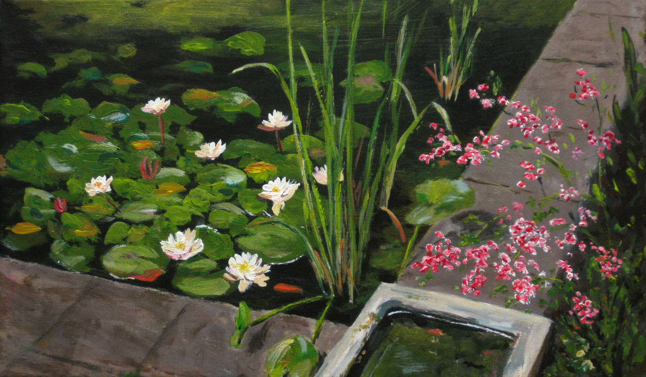 Vijverhoek met waterlelies, (alla prima, net voor de stortbui klaar :)