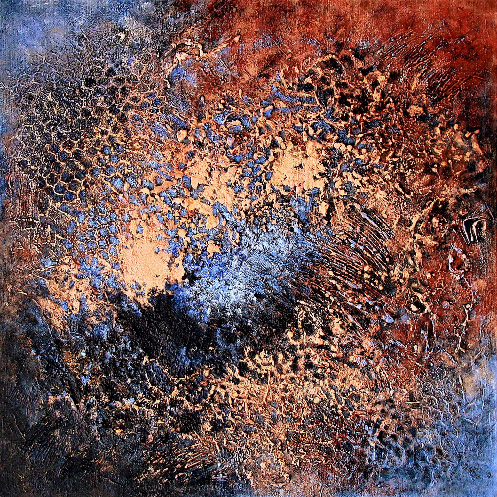Abstract schilderij in mixed media waarin natuurlijke erosie voelbaar wordt in kleur, vorm en textuur. Warme roestbruine en blauwe tinten roepen beelden op van aarde, steen en water die in de tijd zijn gevormd. Intuïtief opgebouwd, voegt elke nieuwe laag iets toe aan de beleving van het doek. De rijke gelaagdheid geeft het werk een robuuste uitstraling vol diepte en energie. Over het werk: gesigneerd · mixed media op linnen · opgespannen op stevig frame · meegeschilderde zijkanten · 4 cm dik doek · klaar om op te hangen Bij vragen neem gerust contact met mij op →