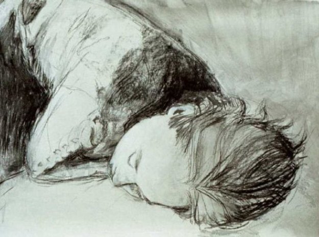 En de derde uit de reeks Tirza. Een slapende vrouw. Houtskool en acrylverf.