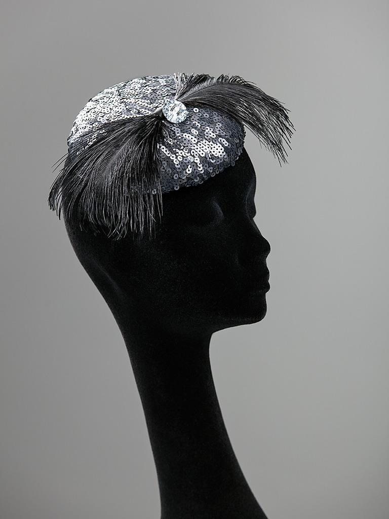 antraciet grijze pillbox met pailletjes, emoe veren en swarovski parel