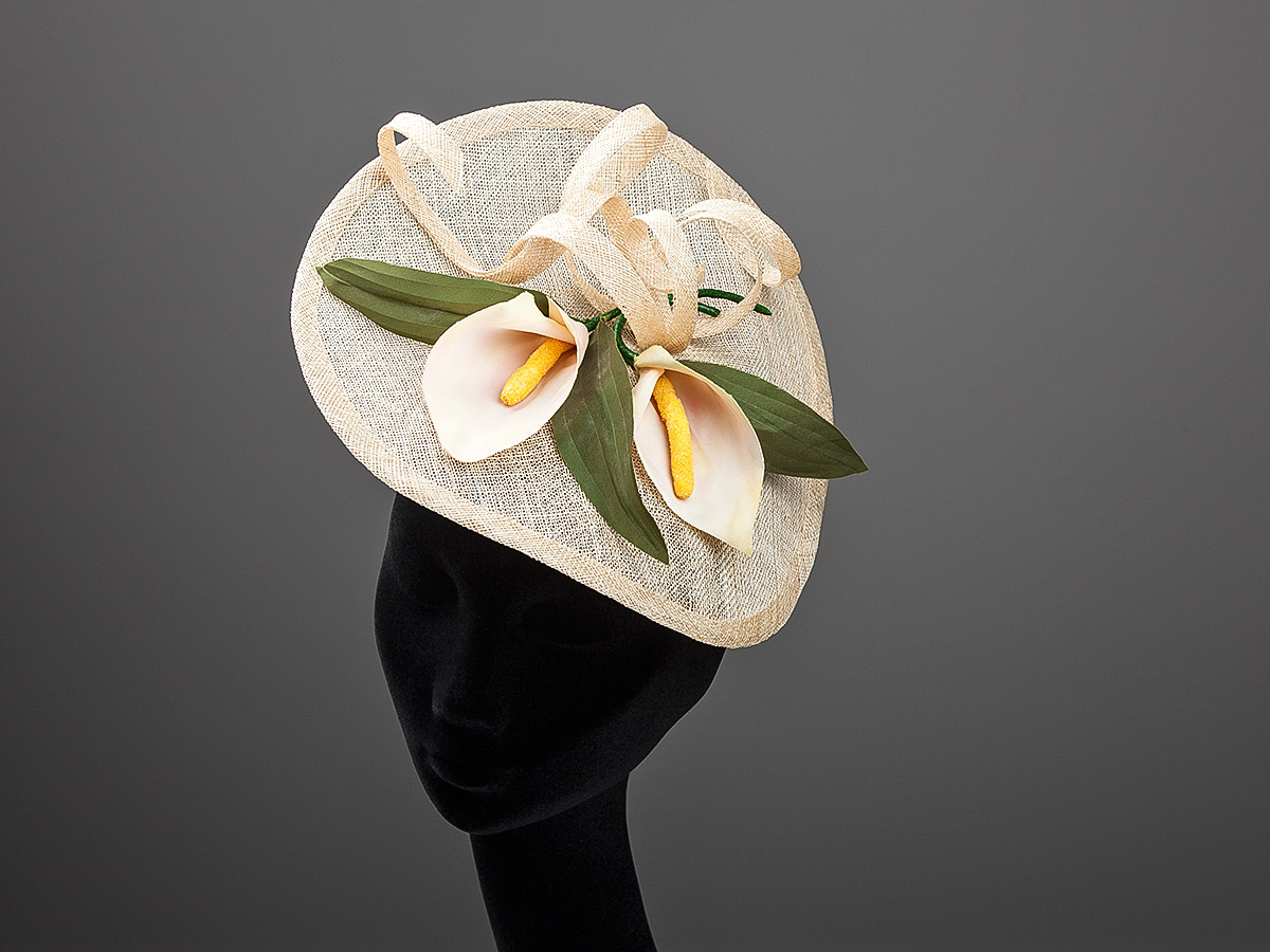 beige sisal fascinator op diadeem met handgemaakte en gekleurde calla's