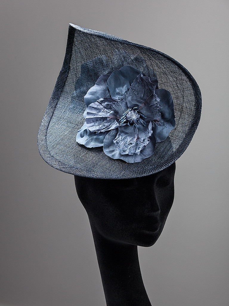 petrol blauwe fascinator met grote handgemaakte fantasie bloem voor en achter
