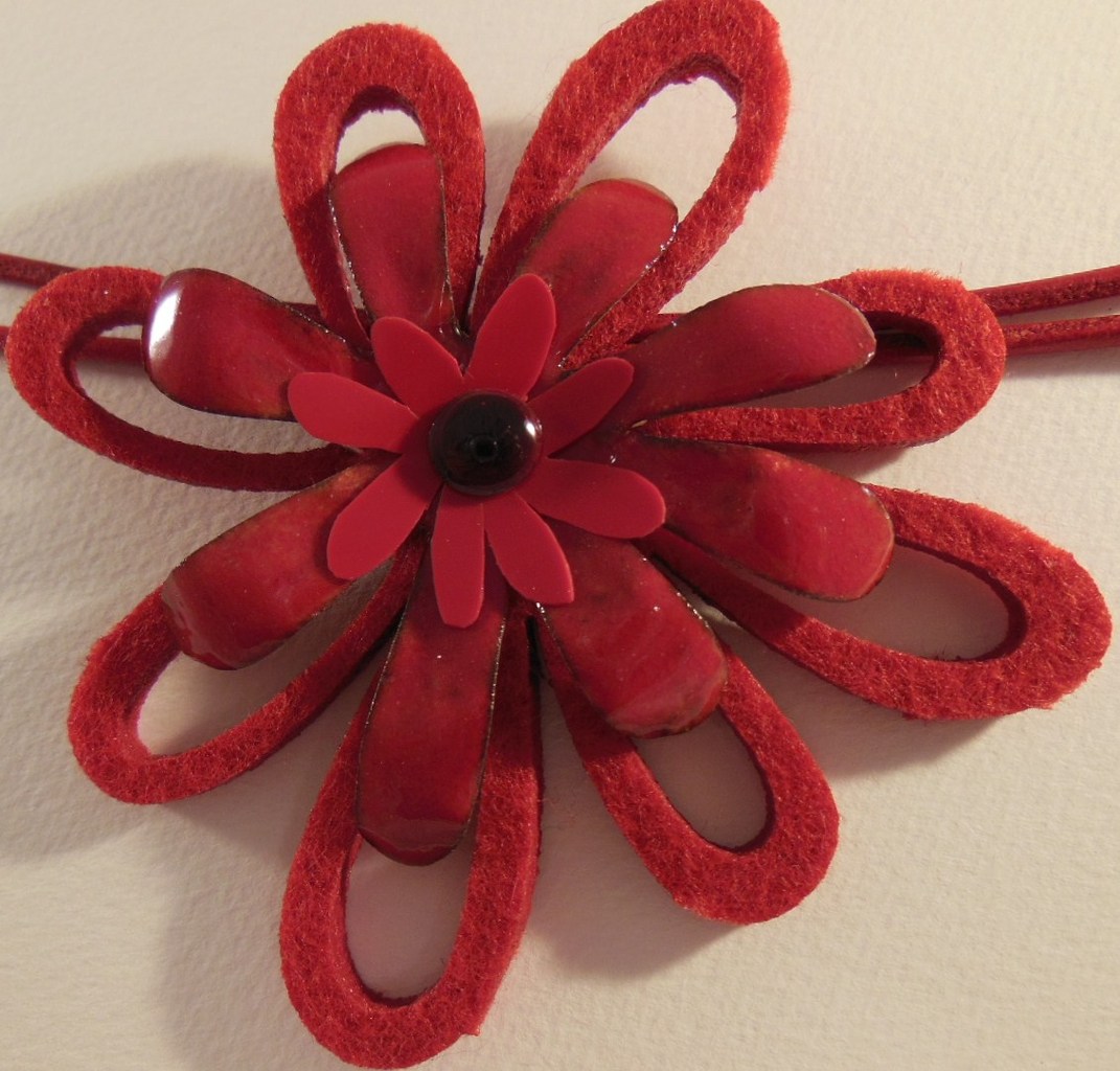 Collier: vilt, emaille op koper, kunststof, zilver, leer.