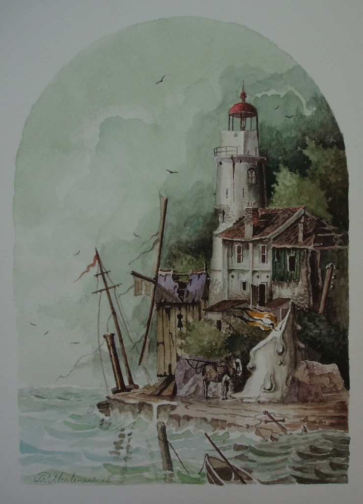 Zeegezicht Landschap Molen Kaars Vuurtoren Marken Paard Aquarel Papier Boot Anker Vogels Zee Stoomboot Bomen Realisme Fantasie Romantiek