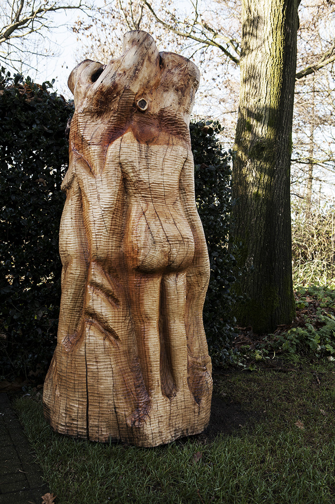 dit beeld is een ode aan de vrouw, er zijn 4 vrouwenlichamen gesculpteerd rondom de stam, het beeld is gemaakt uit een kersenstam