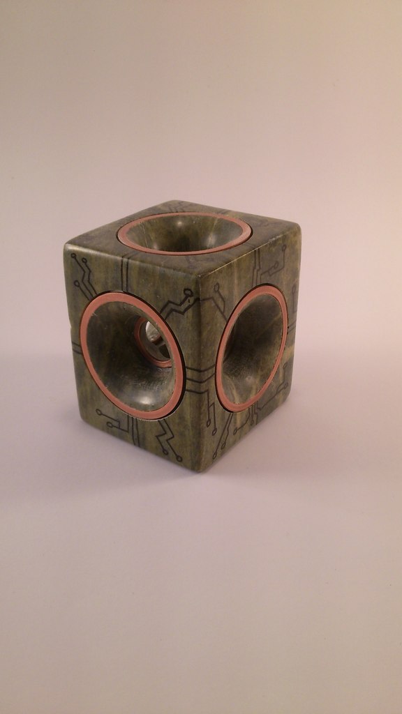 Hyper kubus van speksteen en koperen ringen
