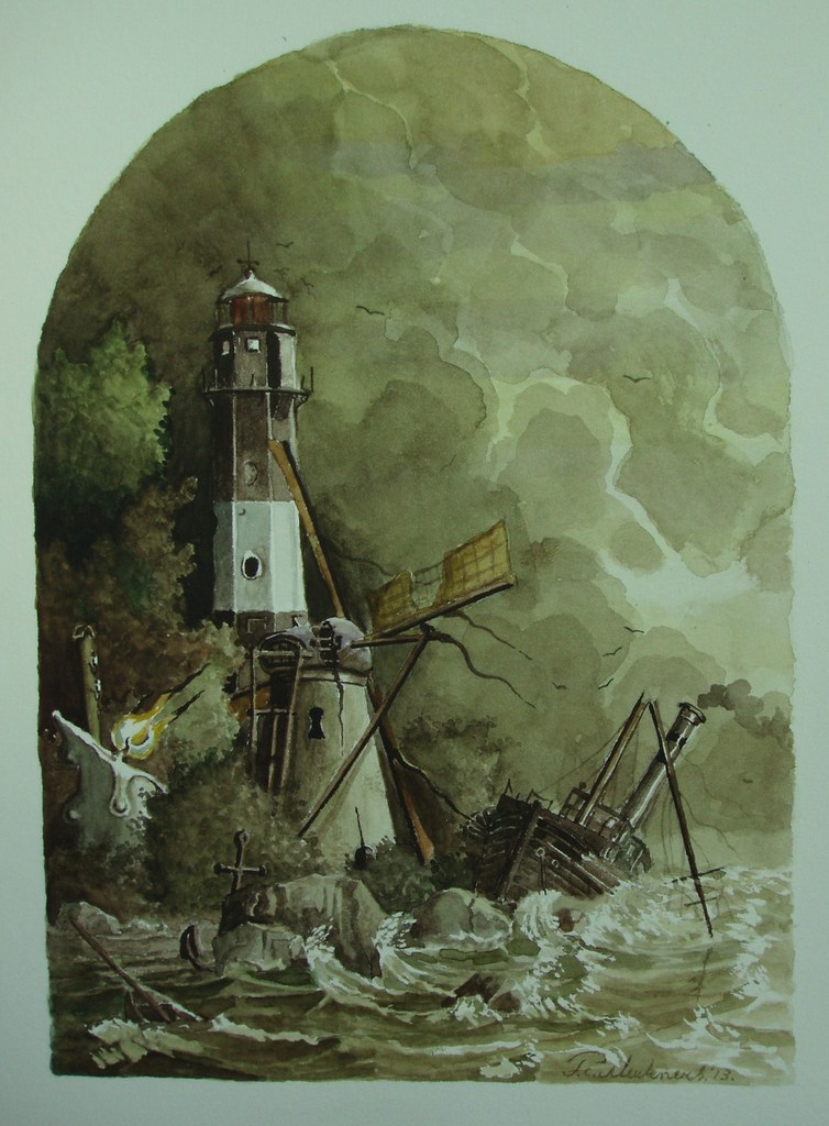 Vuurtoren Breskens Kaars Molen Storm Zeezicht Vogels Anker Papier Aquarel Bomen Landschap Realisme Romantiek Fantasie Groen
