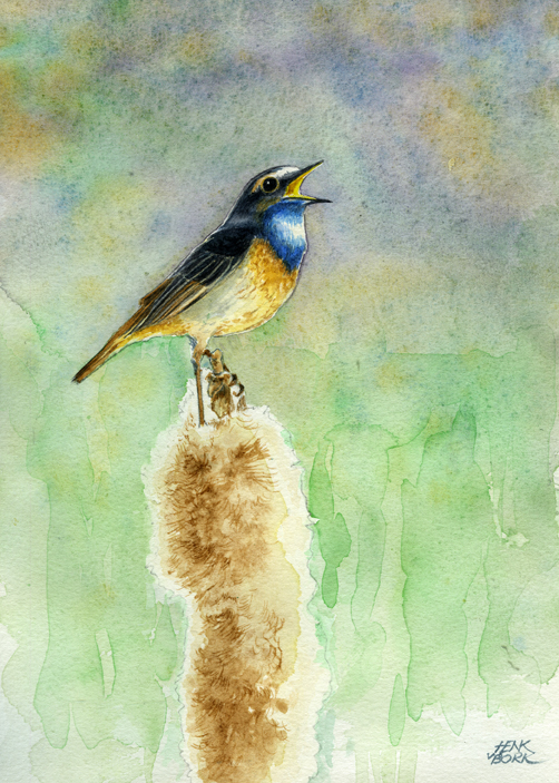 Blauwborst zitten en zingend op de top van een rietstengel/'sigaar'