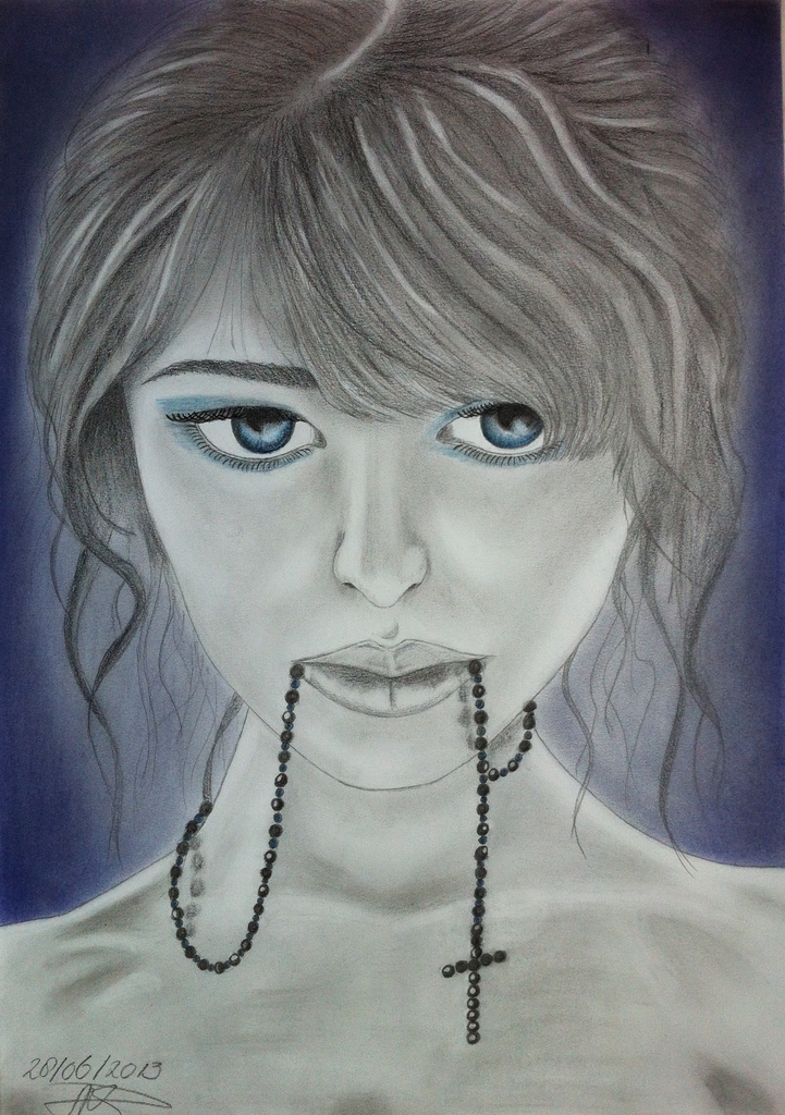 Eigenwijs, krachtig en kwetsbaar, dicht bij haarzelf, doorzetter, puur, gelooft op haar eigen manier. Houtskool, potlood, grafiet, conté.