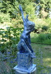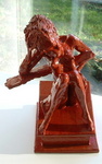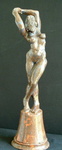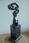 keramisch beeld, staand vrouwelijk naakt, aan pilaster, uit zwarte fijne klei in olieglazuren met veel uitstraling