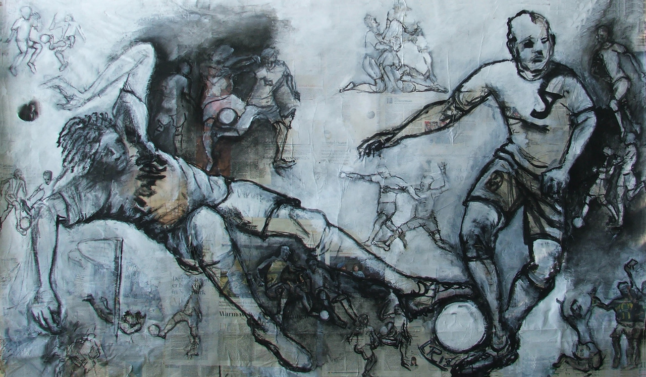 Tekening gemaakt op krantenpapier, speciaal voor expositie Kunstenonder1dak in het voetbalstadion