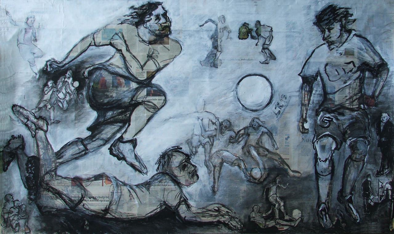 Tekening gemaakt op krantenpapier, speciaal voor expositie Kunstenonder1dak in het voetbalstadion