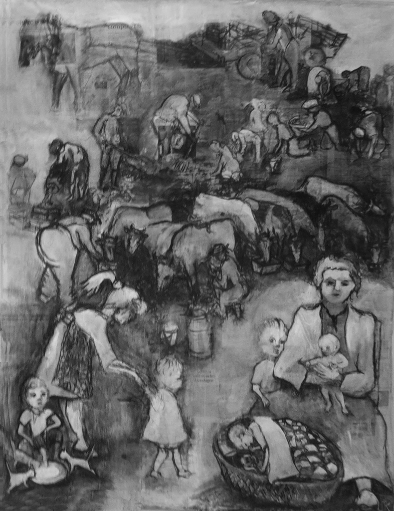 tekening op krantenpapier met gouache, acryl en houtskool