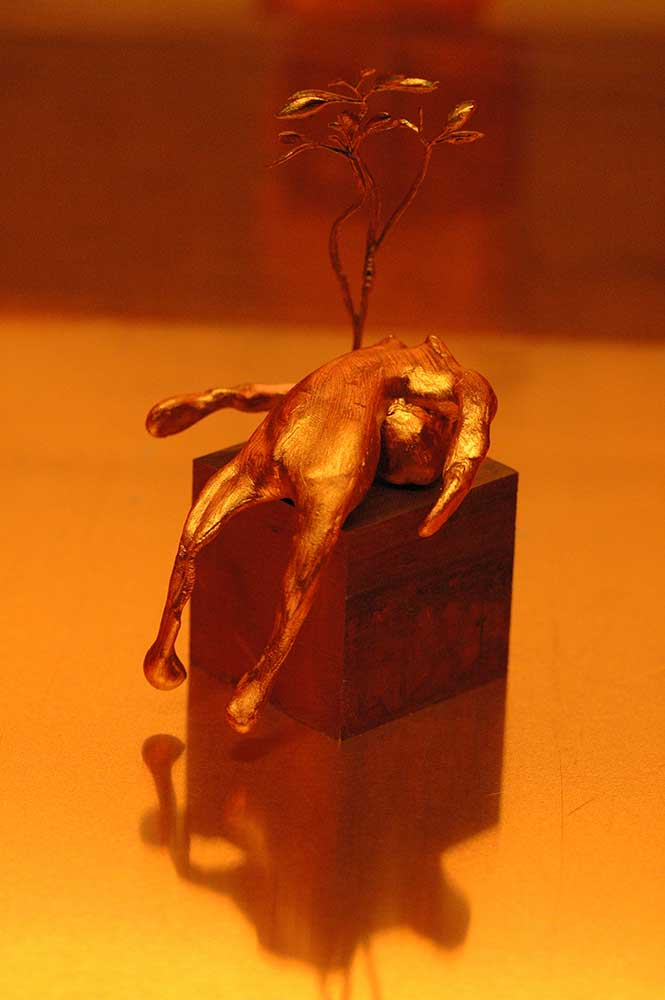 mijn foto’s zijn analoog gemaakt, een vastlegging van licht dat er net als de schimmige figuren maar heel even was. Dezelfde thematiek is te zien op de koperplaten. Deze zijn extreem lang geëtst, waardoor openingen, oxides en structuren ontstaan die het beeld bepalen. De op deze manier imperfecte, want aangetaste mensfiguren vertellen hun verhaal door hun houding en plaats in de ruimte. Tegelijk is duidelijk te zien dat de afbeelding vóór het etsen anders, misschien wel compleet was.